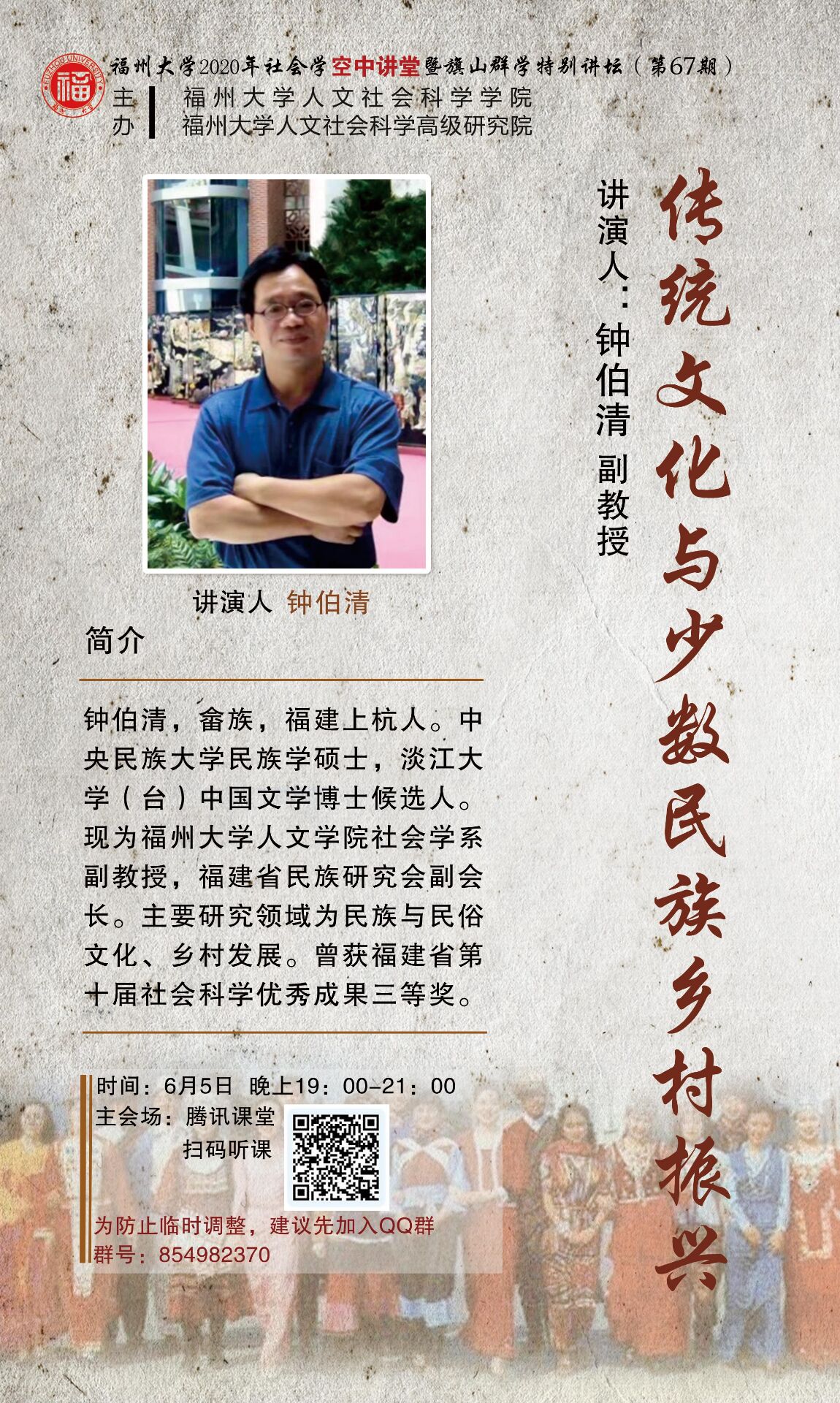 演讲人简介:钟伯清,畲族,福建上杭人。中央民族大学民族学硕士,淡江大学(台)中国文学博士候选人。现为beat365中文官方网站人文学院社会学系副教授,福建省民族研究会副会长。主要研究领域为民族与民俗文化、乡村发展。曾获福建省第十届社会科学优秀成果三等奖。