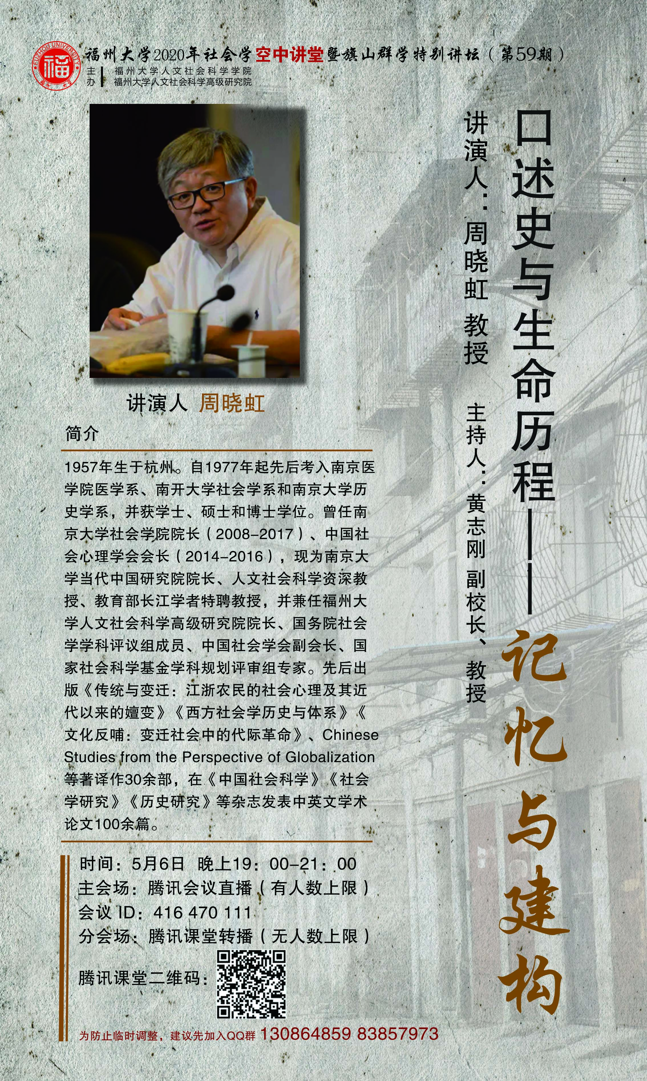 演讲人简介:周晓虹,1957年生,著名社会学家、南京大学人文社会科学资深教授、教育部长江学者特聘教授、博导,beat365中文官方网站人文社会科学高级研究院院长,兼任国务院社会学学科评议组成员、中国社会学会副会长等。周晓虹曾任南京大学社会学院院长,先后出版《文化反哺:变迁社会中的代际革命》、等著译作20余部,在《中国社会科学》、《社会学研究》和《历史研究》等杂志发表中英文学术论文百余篇。